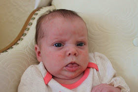 She is great at communicating her discomfort or displeasure. She can be loud. In the last week or so, she's started to find the softer side of her vocal cords, with a few sweet little coos now and then. Her eyes work now (although sometimes cross-eyed), focusing on faces, watching ceiling fans, or tracking her big sister's excited movements.